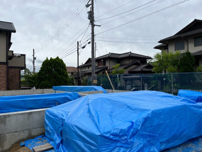搬入後は材料が雨に濡れないようにブルーシートでしっかりと覆っています。