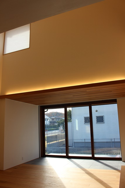 LDKの居心地は抜群です。間接照明は吹抜けをゆったり照らし開放的ながら