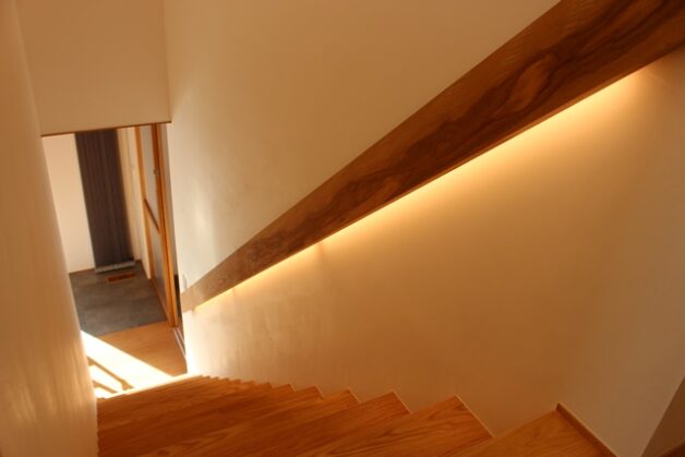 間接照明を施しフローリングと揃えた踏板を優しく照らします。