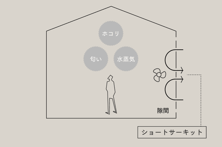 人間は空気中の酸素を体内に取り込んで二酸化炭素を排出します。それ以外にも、人が生活することにより、ホコリや匂い、水蒸気などが発生します。これらを排出し、新鮮な外の空気を取り込むには連続した換気が必要です。また、しっかりした換気を行うためには、住宅の気密性能が関係してきます。気密性能が低い家では、排気ファン周辺の空気だけが交換されてしまう「ショートサーキット」という現象が生じ、家全体の汚れた空気が滞留してしまうからです。