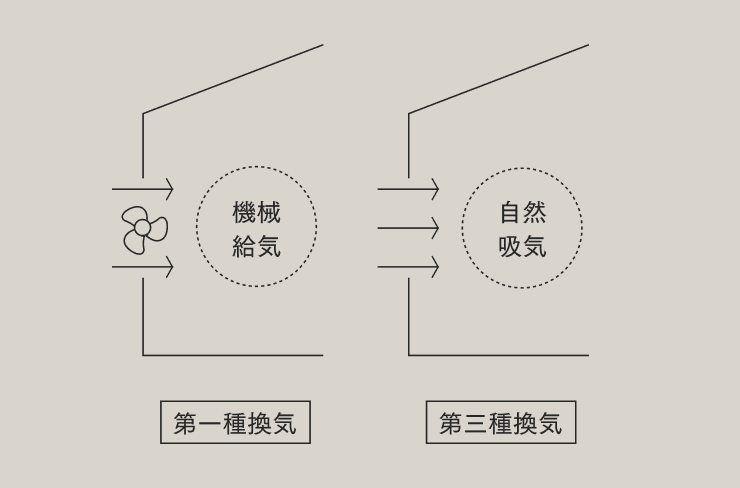住宅の換気システムとして多く採用されるのが、第一種換気と第三種換気です。その違いは、給気をファンで行うか、自然吸気にするかの違いです。第一種換気システムの方が、機械で給気するため安定した換気が行えます。また、「熱交換換気装置」を備えることで、換気による熱損失を抑えられるというメリットもあります。ただし、機器が増える分、費用は高くなります。