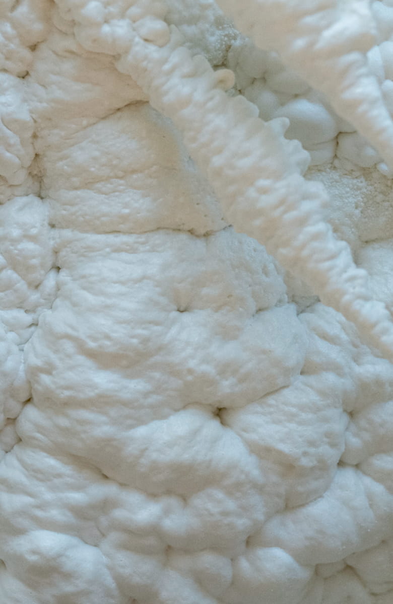 アイシネンLDフォームは、通常の断熱材と異なり、壁の内側に吹き付けて空気を含んだフォームを発泡させるのが特徴。優れた柔軟性があるため躯体に追従し剥離・脱落の心配がなく、また極めて水を吸いにくいなど、優れた特徴があります。