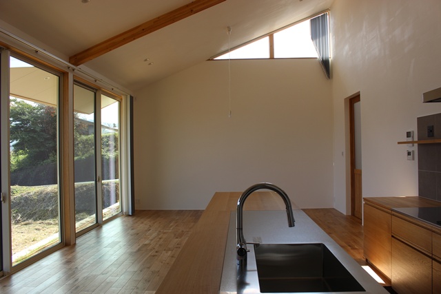その景色はリビング・ダイニング・キッチンすべてから楽しめ、どこにいても自然と一体になれる心地よさです。三角窓からこぼれる柔らかな光も、空間に温もりを添えています。