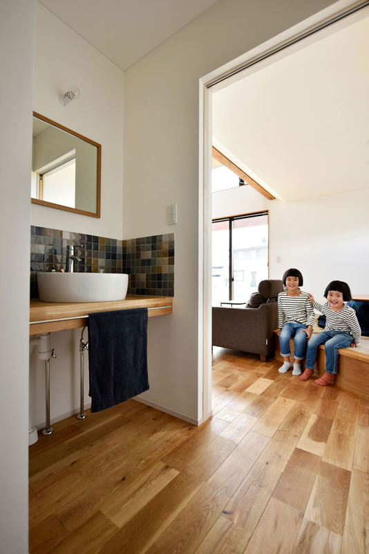 朝の慌ただしい時間でも5人家族が混雑しないように、洗面台も造作で水栓は2つ設けました。洗面、洗濯、部屋干し、パントリーを集約して勝手口へとつながる機能的な家事動線になっています。