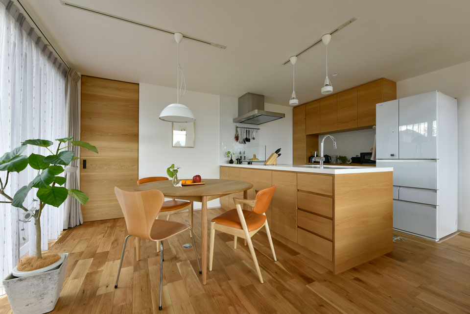 SE構法ならではの大空間でありながら、リビング、ダイニングキッチン、畳スペースと、ほどよく区切られています。さらに、吹き抜けを介して2階のホールとも繋がっているため、心地よいBGMが部屋全体を包みます。