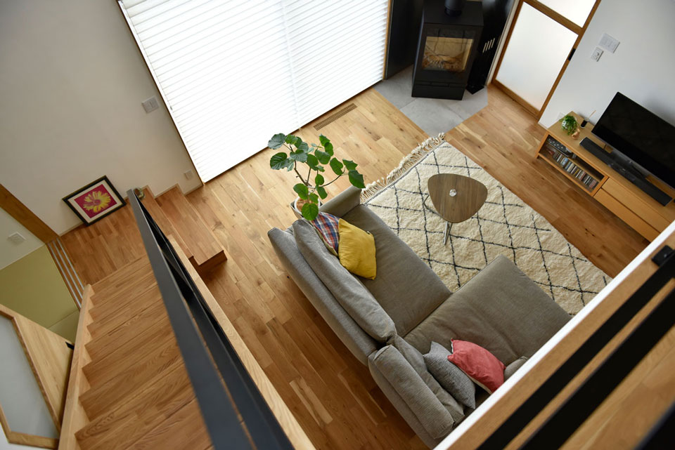 家づくりを依頼されるにあたり、ご主人が最初にご要望されたのが「吹き抜け」と「薪ストーブ」。その両方ともが実現されたリビングルームです。
