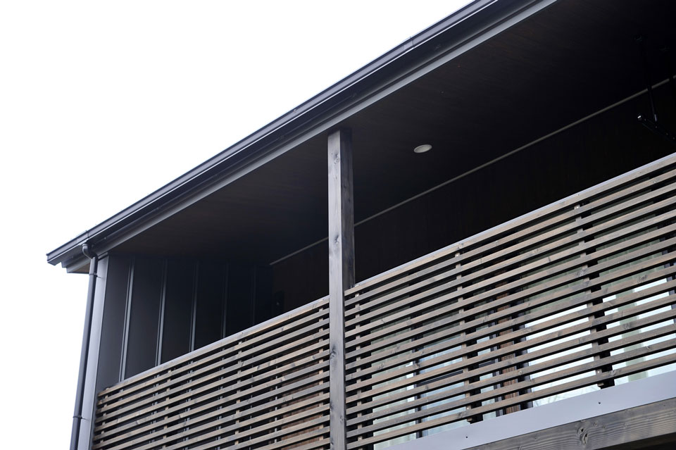 デザインだけでなく、省エネや温熱環境も考えられたK様邸は、国土交通省の「住宅のゼロ・エネルギー化推進事業」による太陽光発電設備の補助金対象にもなりました。また、奥行きのあるバルコニーは、軒先を長くして夏の熱い日射を遮るパッシブデザインの工夫。ちなみに、奥様は、建築やインテリアが好きで、以前からパッシブデザインは知っておられたそうです。