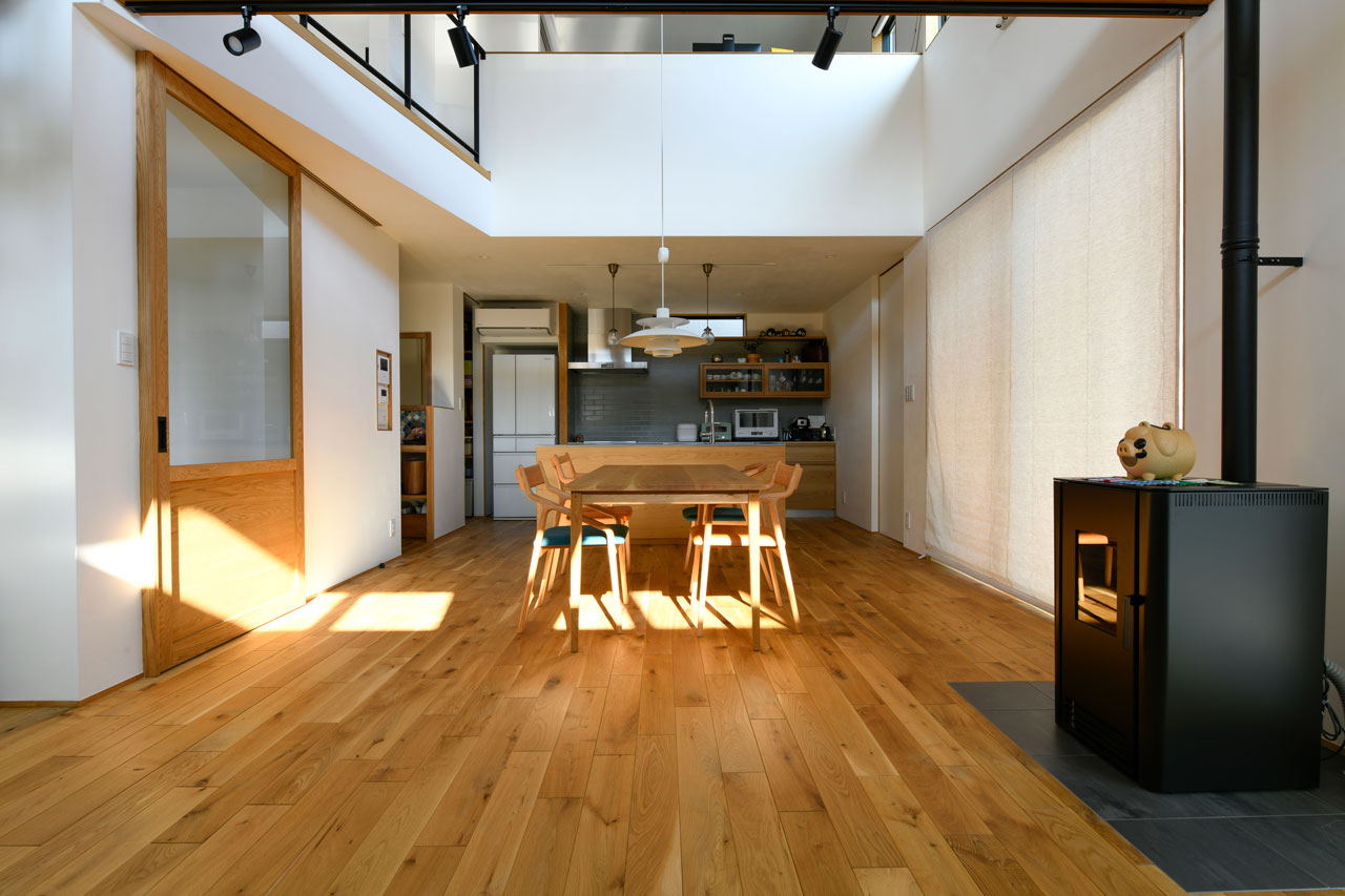 それどころか、1階のペレットストーブを点けると、この吹き抜けを介して家全体が温まり「他の暖房器具は不要です」とY様。ペレットストーブは、薪ストーブと比べて燃料の補給が容易で、燃焼効率が良く煙が少ないため住宅地でも使えることが採用の決め手だったそう。コンパクトな筐体で、設置場所も選びません。