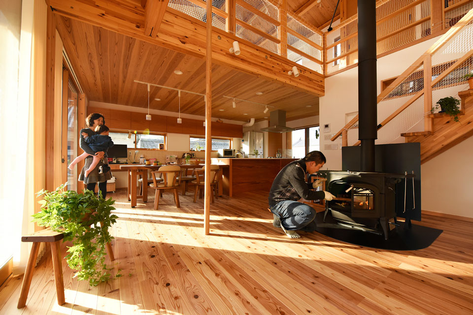 さらに、リビングルームの中央には、このお宅のシンボル的な薪ストーブが。まるで別荘のようです。「薪ストーブのある生活はお互い憧れていましたね。薪代や掃除の手間のことは気になったけど、やっぱり雰囲気は最高です!」