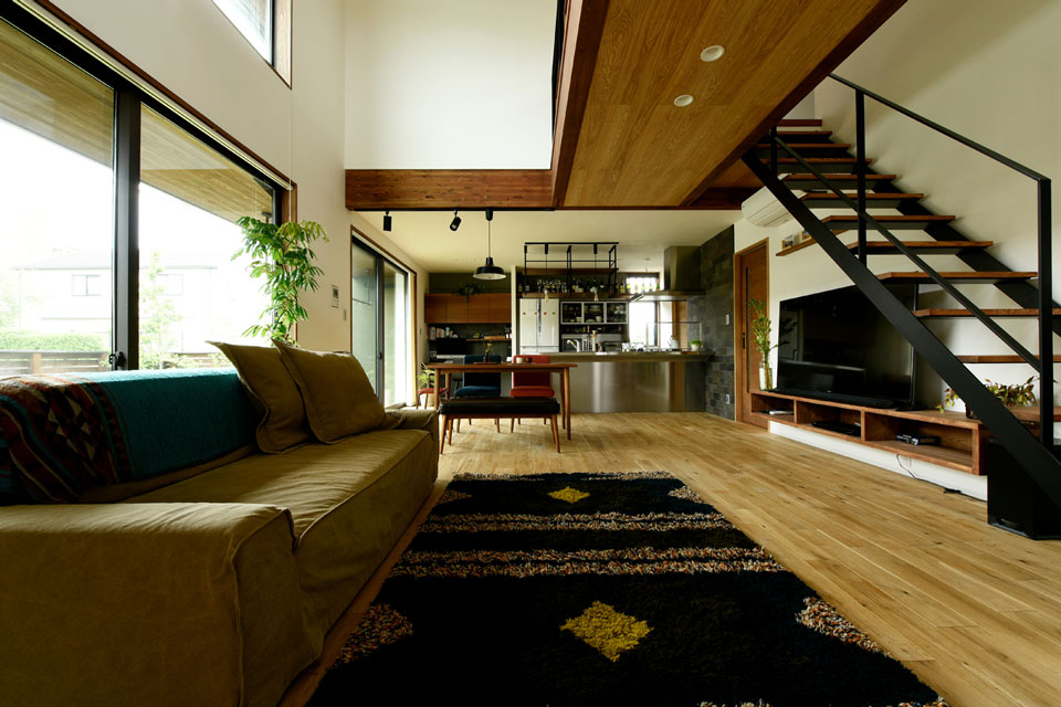 柱を必要としない大空間リビングは「在来工法で建てる他社では実現しないんです」とS様。プランを検討している時期に参加した完成見学会で、内装のイメージもだんだんと固まり、最終的にはダークブラウンの自然塗料で室内を仕上げました。