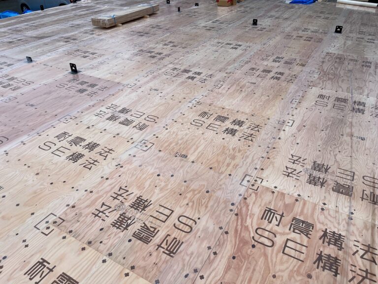 土台敷きに引き続き床合板敷きの様子です。