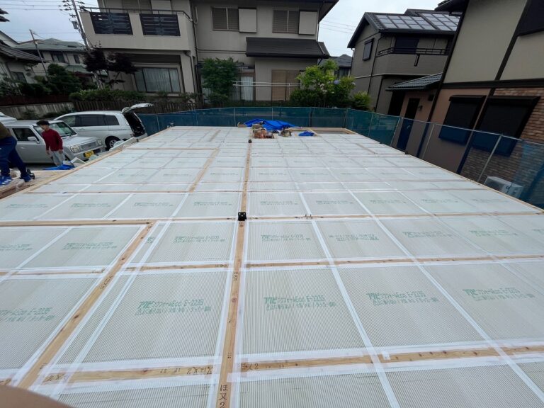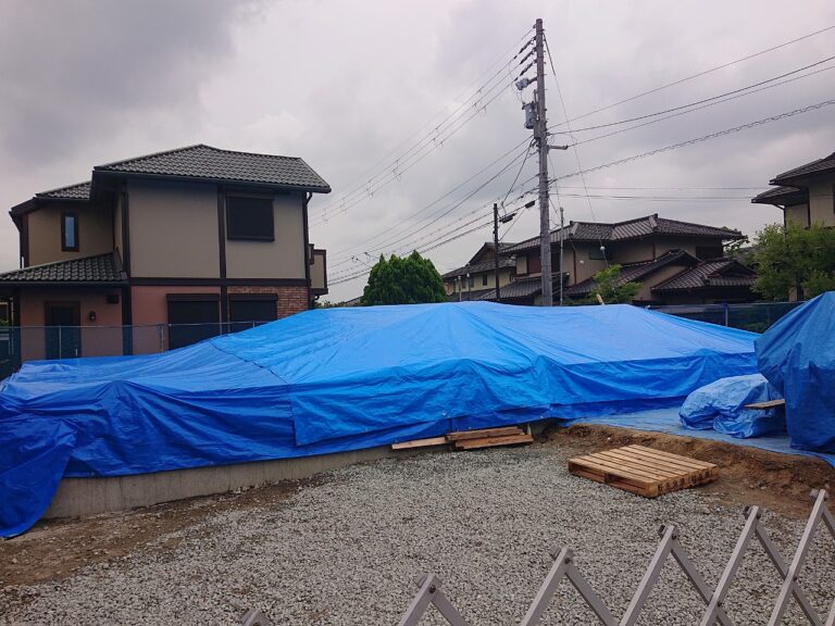 上棟日まで雨に濡れないようブルーシートでしっかり養生しました。