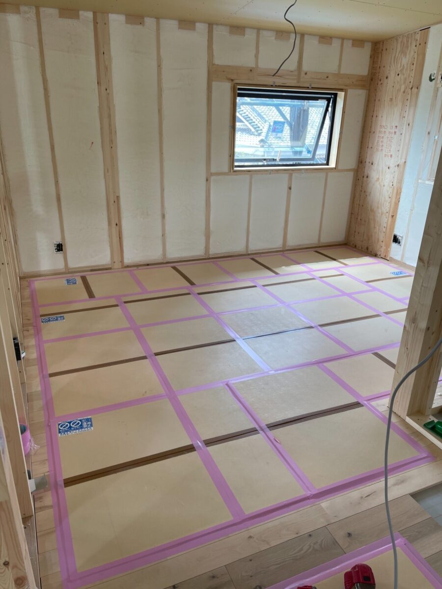 床材がある程度貼り終わると、しっかりと養生していきます。あとはこの作業の繰り返しです。