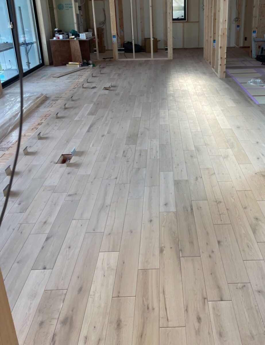 乱尺フローリングは一枚一枚の長さが一定ではありません。なので大工さんのセンスで長さや木目、色などを確認し貼り進められていきます。