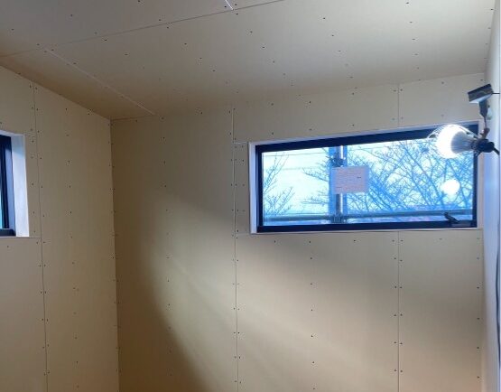 柱や梁の軸組だけではなかなかイメージも湧きませんが、石膏ボードを貼ることにより空間の広さや高さが分かりやすくなりかなりお部屋っぽくなってきました。