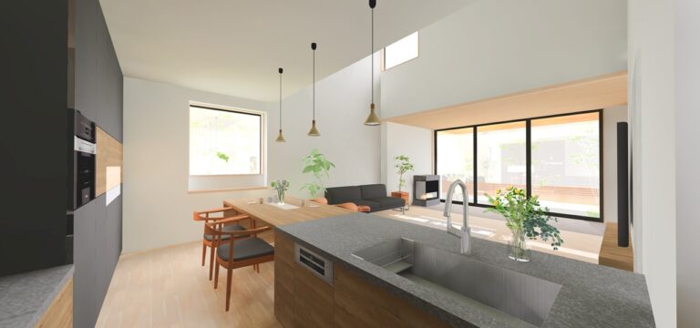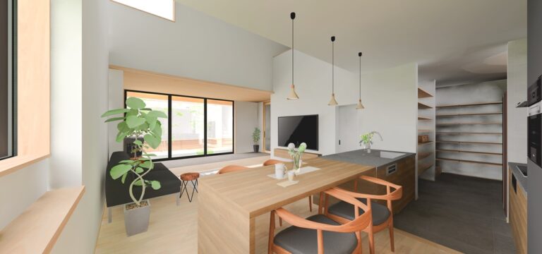 LDK全体が見渡せる位置にダイニングテーブルと横並びの2連型キッチンを設けました。