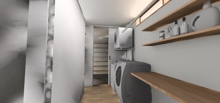 お仕事柄帰宅されて直ぐ着替えが必要な為、バックスペースは玄関、シューズクロークからランドリー脱衣室に直接アクセス出来る様になっています。