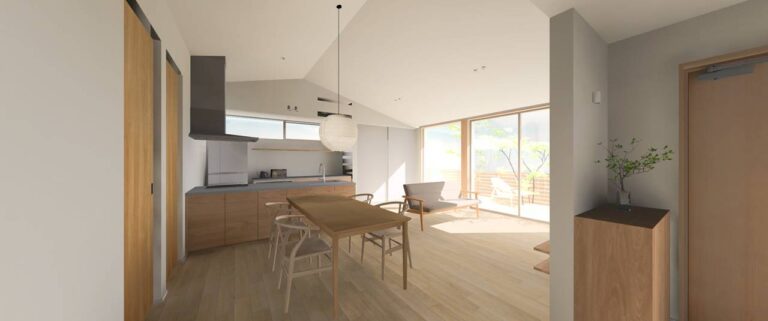 半平屋の間取りをご提案させて頂き、LDK部分は勾配天井で広く開放感のある空間になりました。