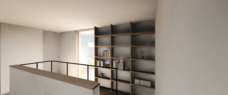 2階には奥様が大切にされてきた本を沢山収納出来るように、ホール部分に壁面いっぱいの本棚を設置する予定です。