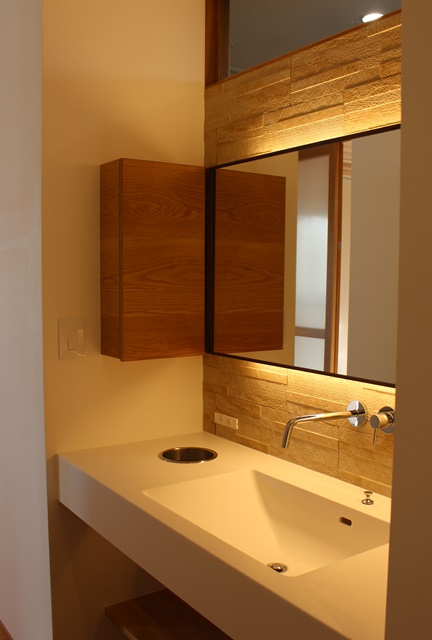 洗面台は木製ミラーに間接照明がる映えるホテルライクの印象になりました。