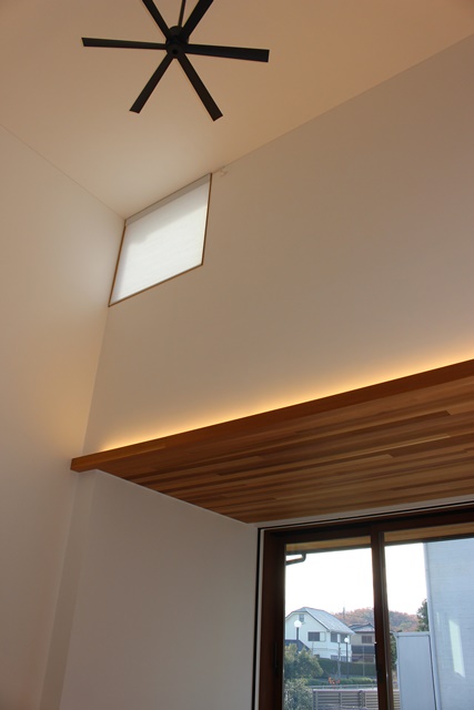 LDKの居心地は抜群です。間接照明は吹抜けをゆったり照らし開放的ながら