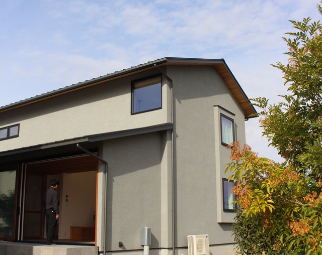 ライトグレーの塗り壁、1・2階に繋がる出窓部分も同色とし、