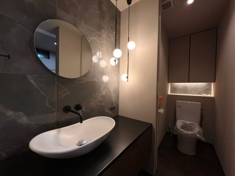 造作の洗面やタイル、照明等、沢山のこだわりが詰まったスペースです。