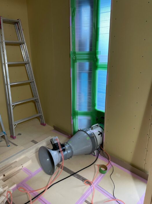 こんにちは工務の中西です。 現在建築中の気密測定を先日二件行いましたのでご紹介させていただきます。 測定を行う前に作業段階的に塞がれていない配管や設備用の穴などを完成後を想定して養生テープなどで塞ぎます。 その後送風機と測定器を設置し測定を始めていきます。