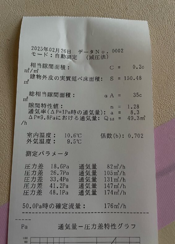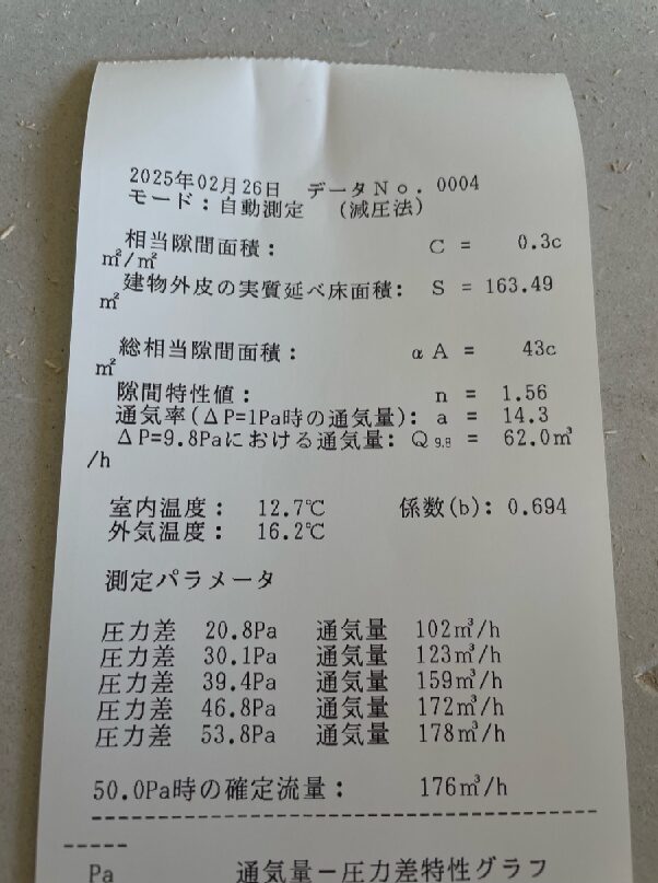 送風機で家の中から屋外に向けて風を送り、その際の通気量や屋内外で生じる圧力差を測定して総隙間面積を測定します。 結果は C値=0.3とC値=0.2で非常に気密性が高いことがわかります。