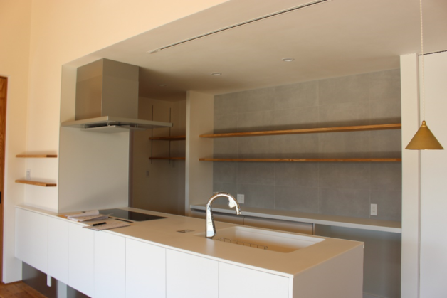 落ち着いたタイルや造作棚と組み合わせ、空間に一体感が生まれました。
