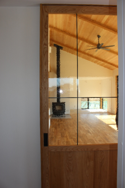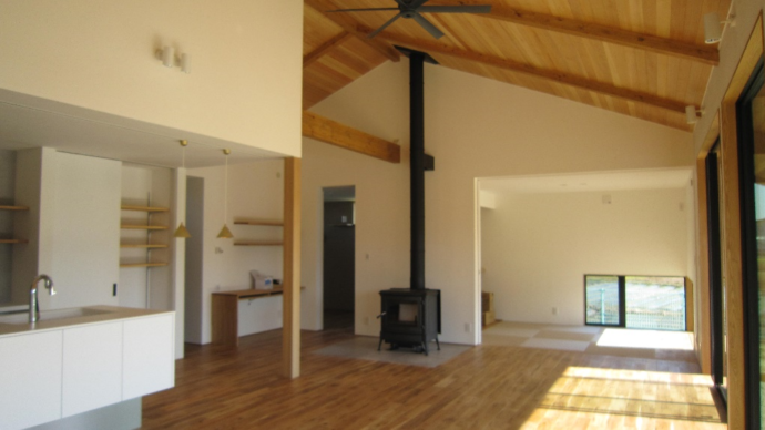 勾配天井の無垢板張りで迫力のある空間になりました。