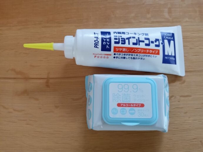 使用材料は、クロス補修材(ホームセンターで入荷可能)・ウェットティッシュになります。
