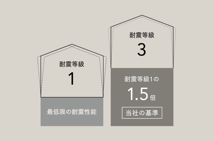 我が国では、建築基準法により地震に対して一定の強さを持つ建物を建てることが義務付けられています。この基準が「耐震等級1」です。ただし、これは法律で定められた“必要最低限の強さ”と捉えてください。大きな地震でも倒壊や損壊を免れるためには、耐震等級1よりも強い、等級2または等級3を基準とする必要があることが研究で示されています。そのため、マイ工務店では最高等級である「耐震等級3」を基準に設計を行っています。