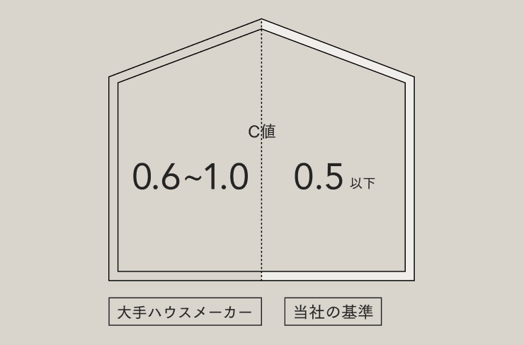 その中で、マイ工務店ではC値=0.5以下を基準に家づくりをしています。大手ハウスメーカーのC値が0.6〜1.0、さらに気密性能を高めにくいプレハブ系の住宅では2.0〜5.0ですから、それらを大きくしのぐ数値といえます。