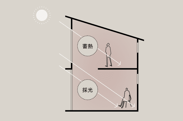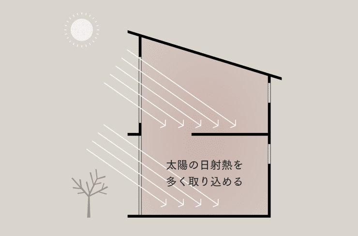 パッシブデザインをさらに具体的に紹介しましょう。冬は太陽の高度が低くなるため、窓を大きくすることにより太陽の光が室内の奥まで届きます。この光をそのまま明るさや日なたのポカポカとした暖かさとして活用するのはもちろんのこと、日の当たる場所に石やタイルなど蓄熱性の高い材料を用いることで、昼間に熱を蓄えて夜に熱を放出してくれます。日が沈んでも、太陽光の熱の恩恵をうけることができるのです。