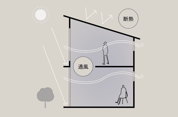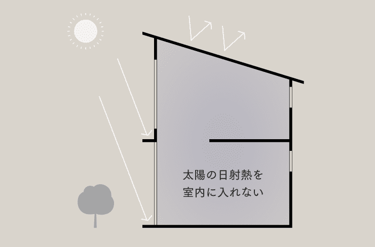 夏に室内に入ってくる太陽の日射熱をηAC値(イータ・エーシー)と言います。この数字が小さいほど、外の暑さをブロックしていることになります。日射熱は主に窓から入るため、日差しを遮る工夫が重要です。あわせて、建物外皮の断熱性能を高め、外部の熱を室内に伝えにくくします。特に、直射日光にさらされた屋根からの熱を室内に伝えない断熱は重要です。