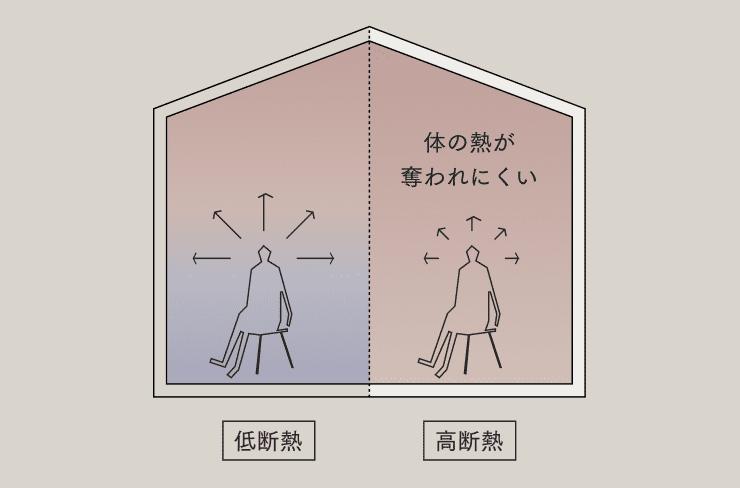 断熱性能の高い家に引っ越した方のご感想でよく耳にするのが「体が楽になった」という言葉です。これはどういうことでしょう? 私たちの体は熱を作り出し体温を維持します。しかし、断熱性能が低い家はその熱をどんどん奪い取ります。熱は高いところから低いところへ移動する性質があるからです。そして、熱を奪われ続ける体は疲れてしまうのです。その点、高断熱の家では体の熱が奪われることがありません。これが「体が楽」な理由なのです。