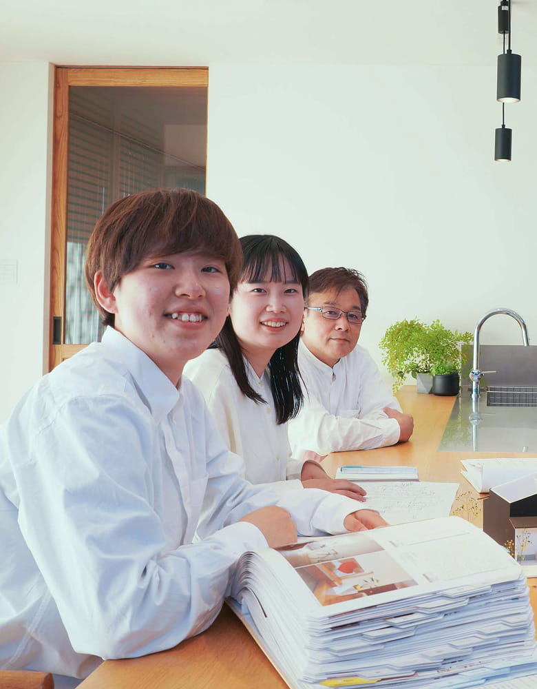 マイ工務店では、気兼ねしない明るい雰囲気の中、スタッフ同士が切磋琢磨しながら、お客様に感動いただける質の高い住宅づくりを日々めざしています。
