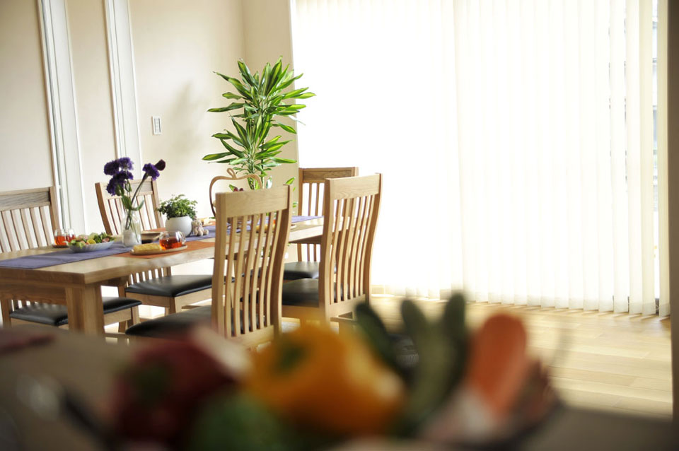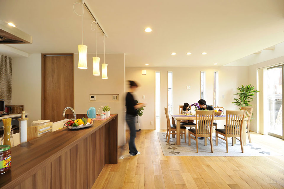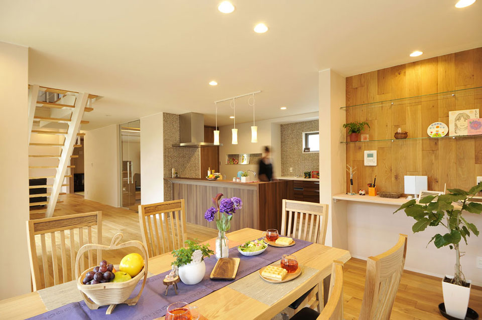 リビングダイニングキッチンは42畳あります。最初は30畳ぐらいでいいかな?と思われていたそうですが、42畳のプランを提案されて、「ここまでできるんだ!」と。仕事仲間を集めてワイワイやるのが夢だったご主人には、うってつけでした。また、SE構法のラーメン構造により、南面に大きな開口部を設けたリビングダイニングキッチンは、たっぷりと陽射しが降り注ぐ、とにかく気持ちのよい空間となりました。