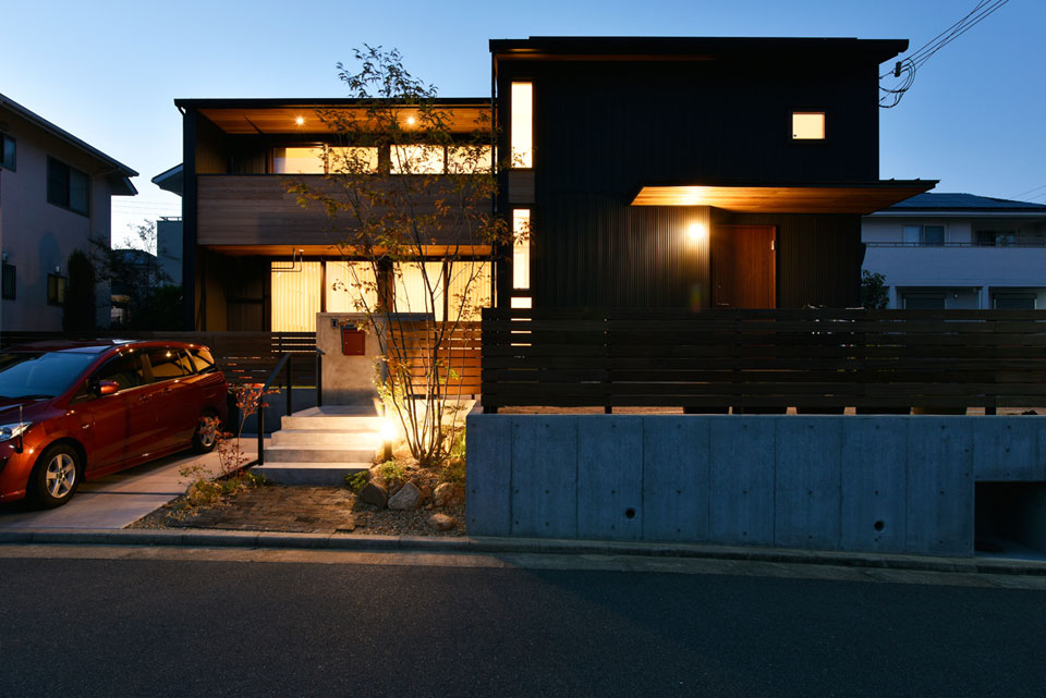 黒いガルバリウム鋼板とレッドシダー材の組み合わせが目を引く外観が特徴的なお宅です。