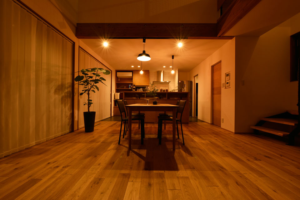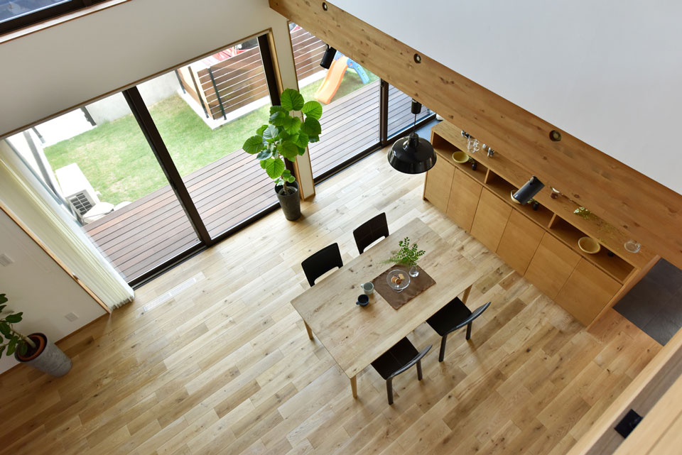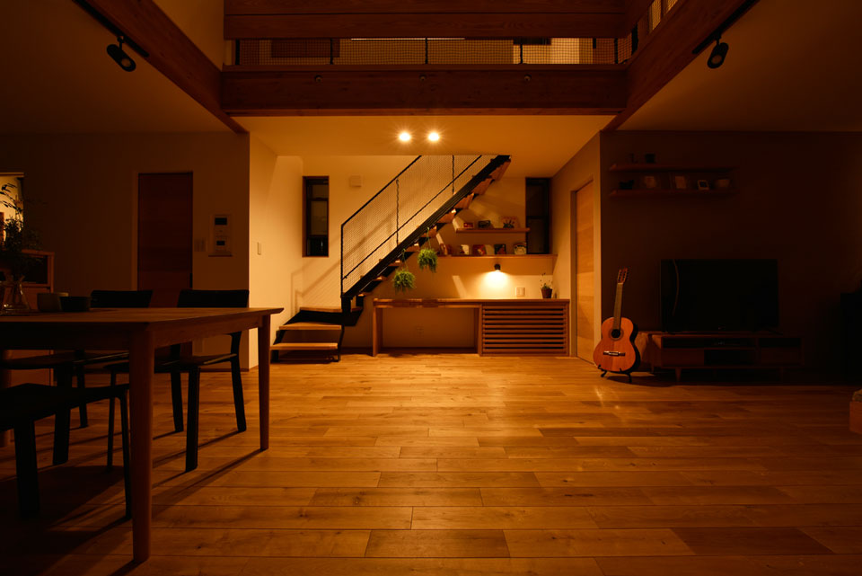 バーベキューが大好きなご主人のための庭には芝を貼り、さらに夏はお子さんたちのプールスペースにもなるウッドデッキを。日が暮れると、大きな開口部がまるで街を照らすように輝くW邸。この光に負けないくらい明るいご家族の成長を、マイ工務店のスタッフ皆が楽しみにしています。