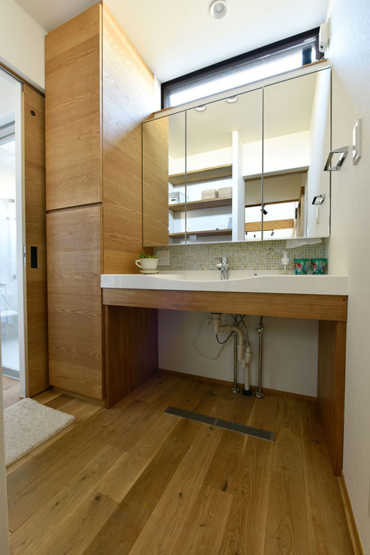 洗濯室を分けることで、洗面所をお客さまにも使ってもらえるように。これは、将来自宅で英会話教室を開くことを想定してのことだそうです。