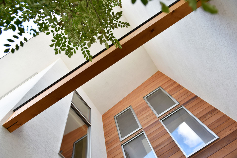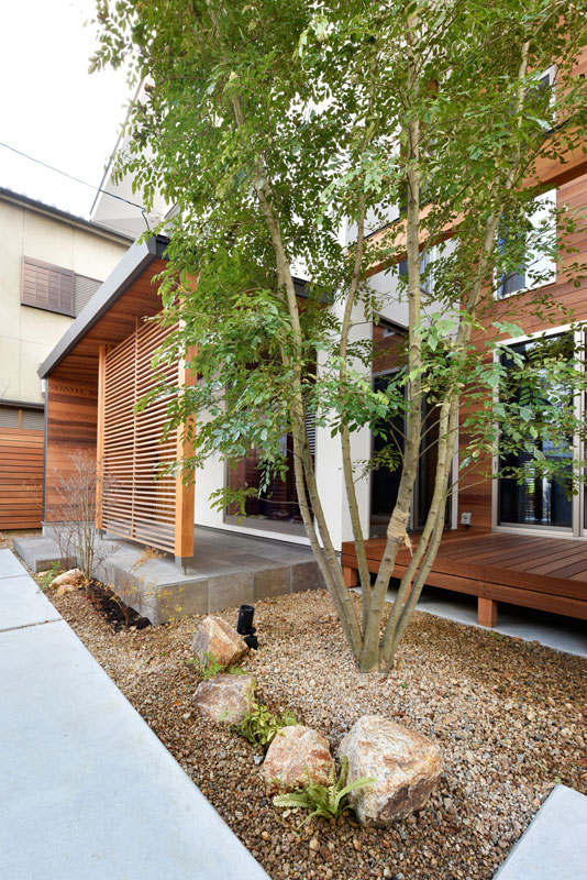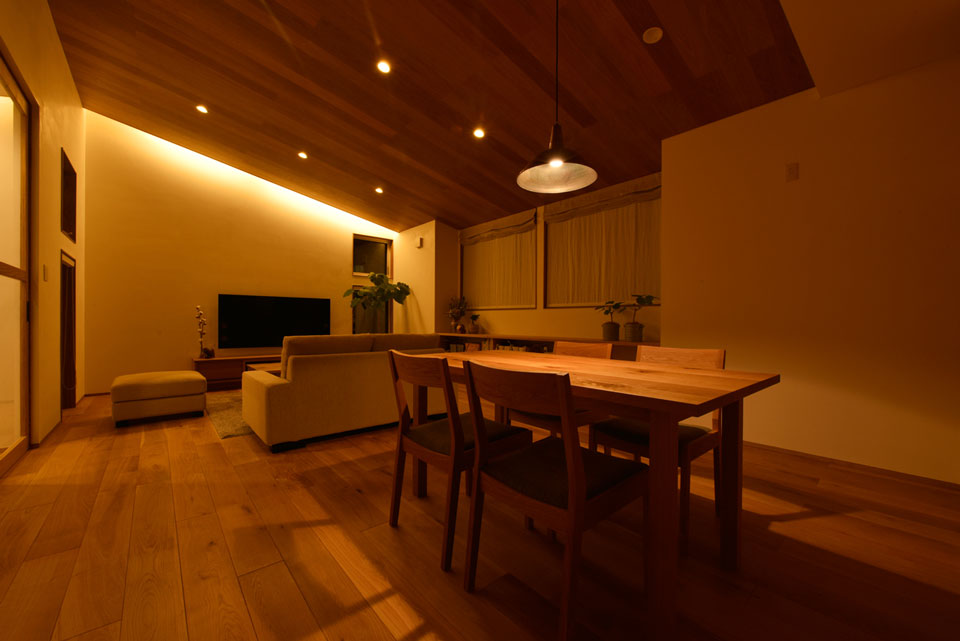 日が暮れてライトアップされると、軒裏にシンボルツリーのシルエットが浮かび上がり、印象的な夜の表情を魅せるS様邸。歴史ある大和高田の街並みに、新たな風を呼び込む存在となってくれそうです。