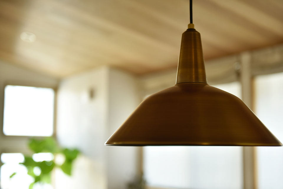 きめ細やかな質感を叶えるため、フローリングには入手困難な幅広の無垢オーク材を使いました。さらに、人気のため3か月待ちで購入されたというキッチンのTAiGAランプと、ダイニングテーブルのflameペンダントライト。真鍮の質感が空間のスパイスになっています。