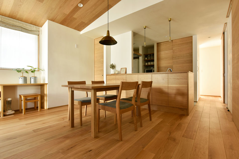漆喰のホワイトとオーク系のブラウンでまとめられたLDK。