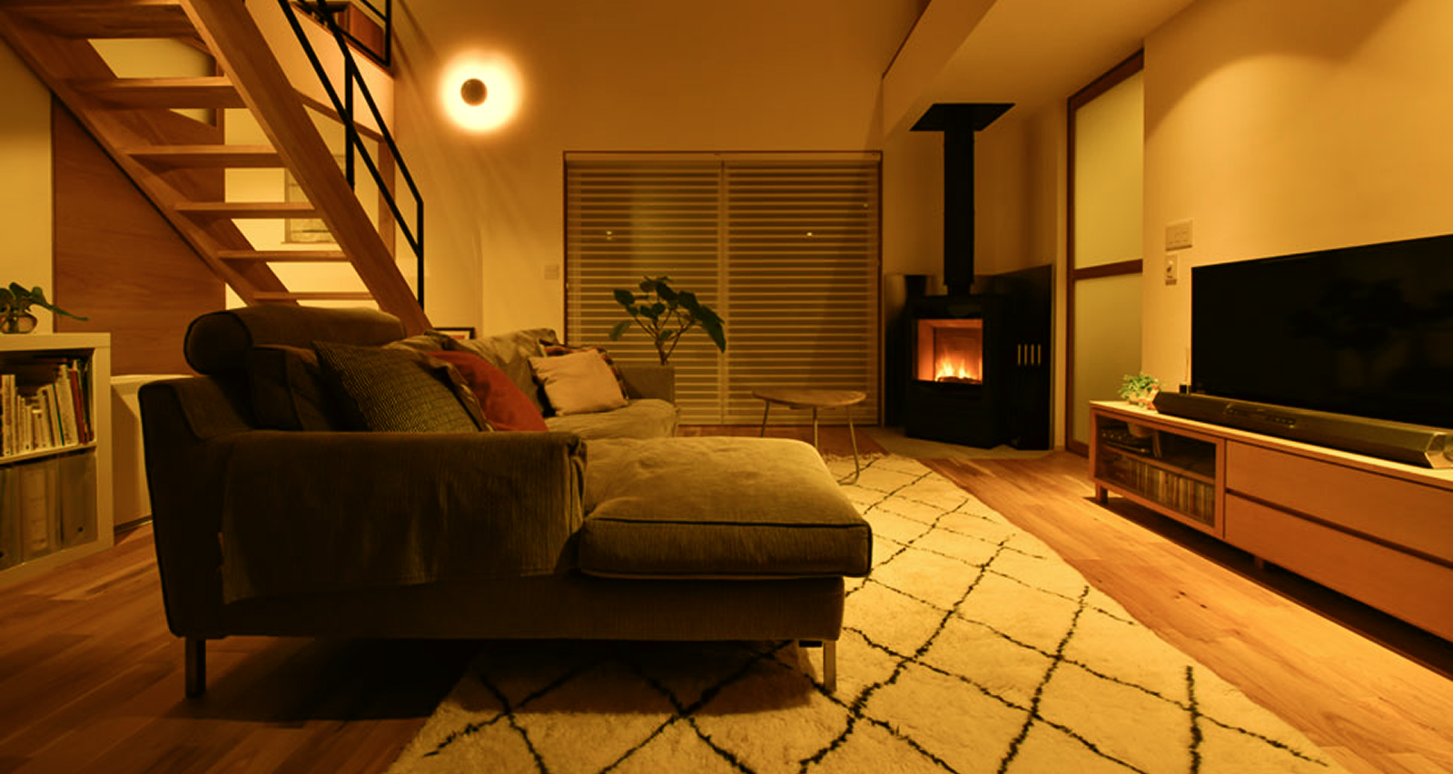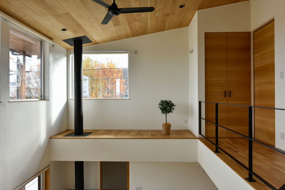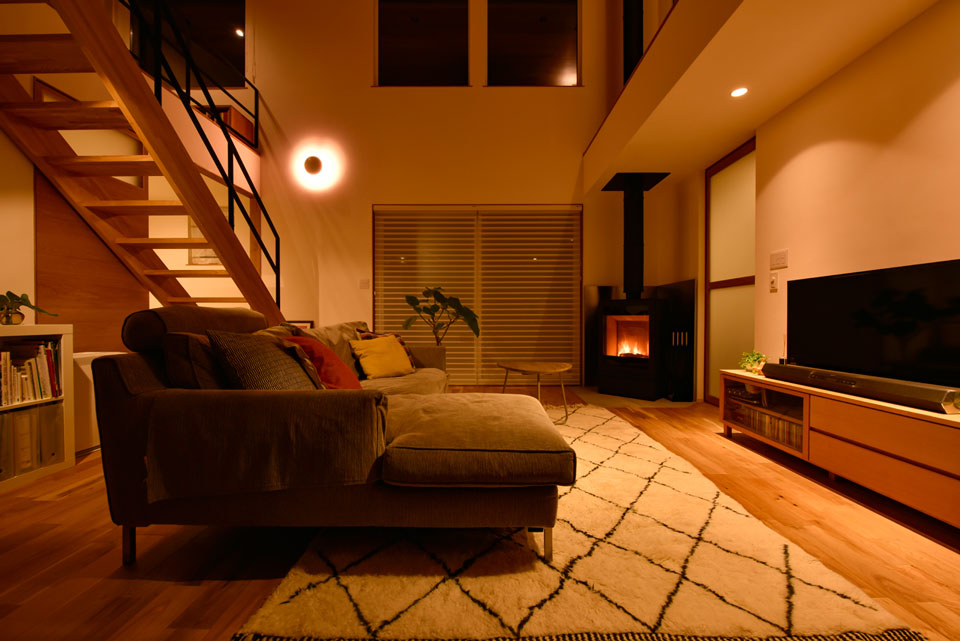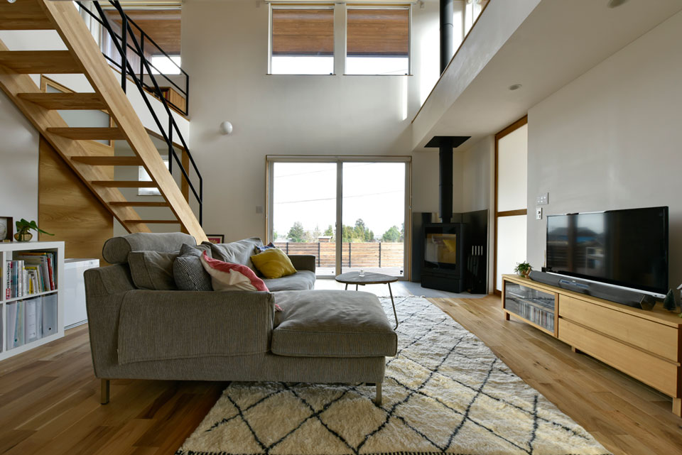 家づくりを依頼されるにあたり、ご主人が最初にご要望されたのが「吹き抜け」と「薪ストーブ」。その両方ともが実現されたリビングルームです。