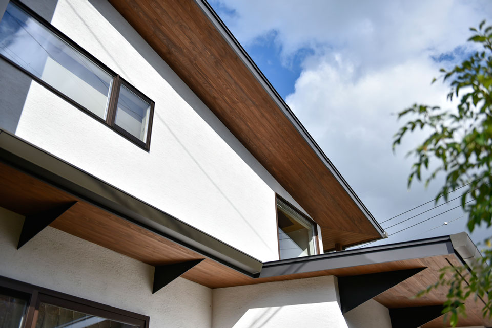 深い軒に守られた外観は、自然と調和し白壁を引き立たせるデザインです。