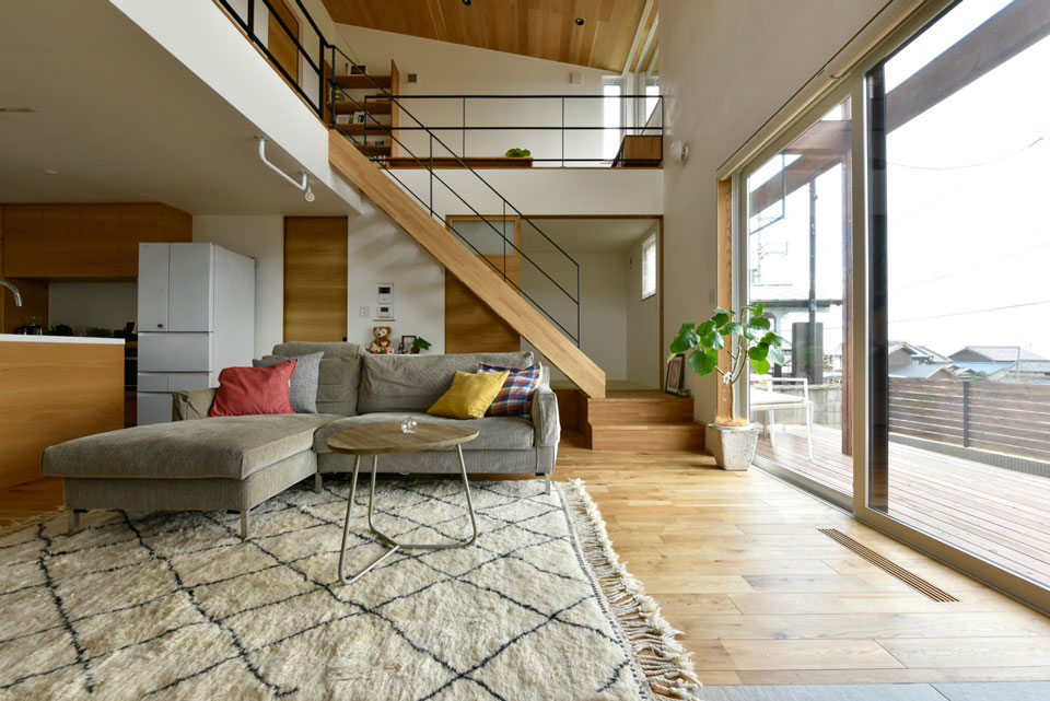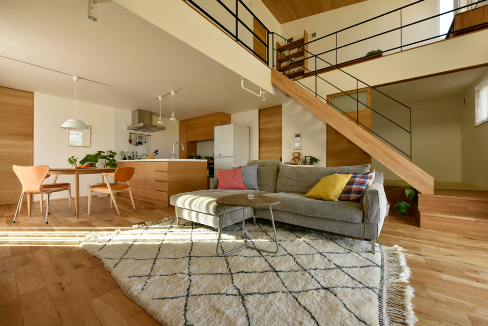 SE構法ならではの大空間でありながら、リビング、ダイニングキッチン、畳スペースと、ほどよく区切られています。さらに、吹き抜けを介して2階のホールとも繋がっているため、心地よいBGMが部屋全体を包みます。