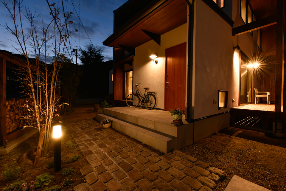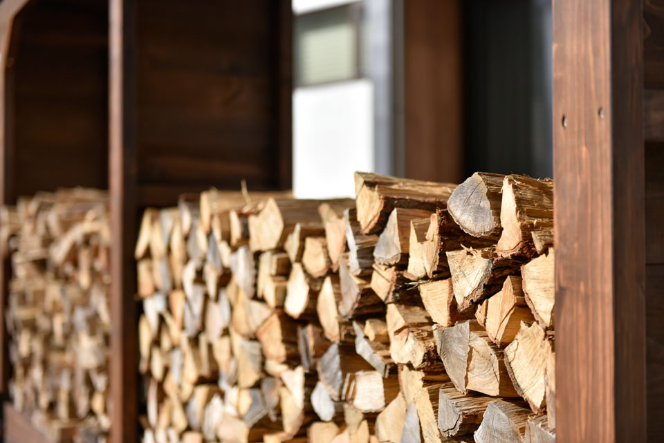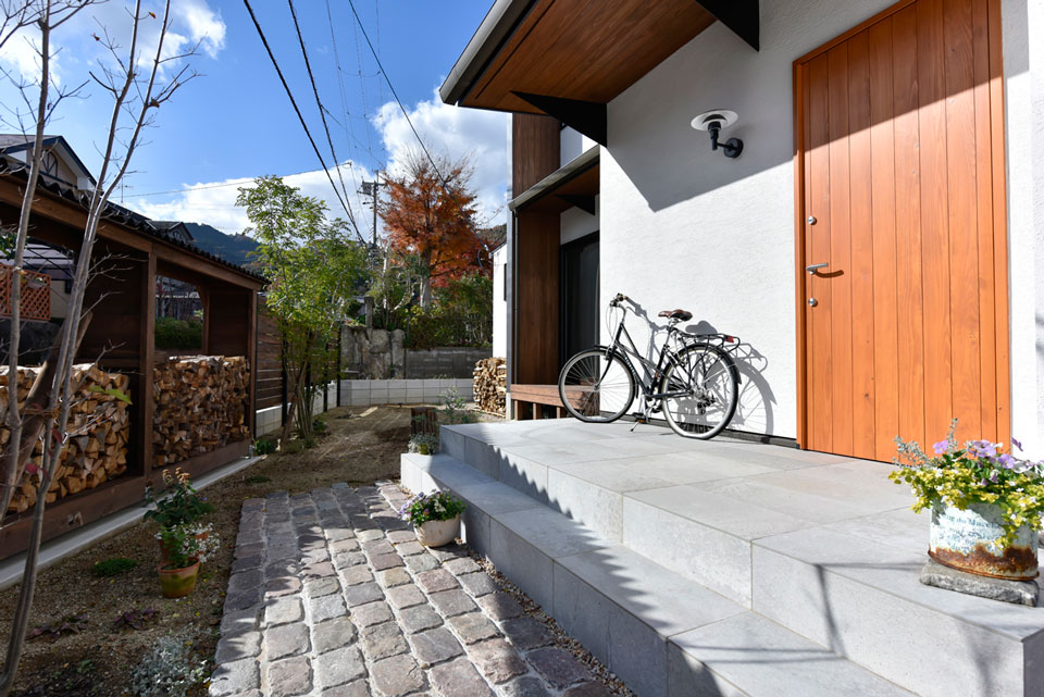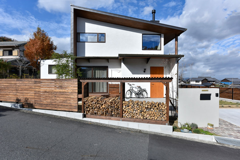 南側に面した道路は二上山の登山口にあたるため、休日はハイカーが行き交います。そんな前面道路から、程よく玄関のアプローチを目隠ししてくれるのが薪置き場です。ひと冬分の薪をストックされるそうです。
