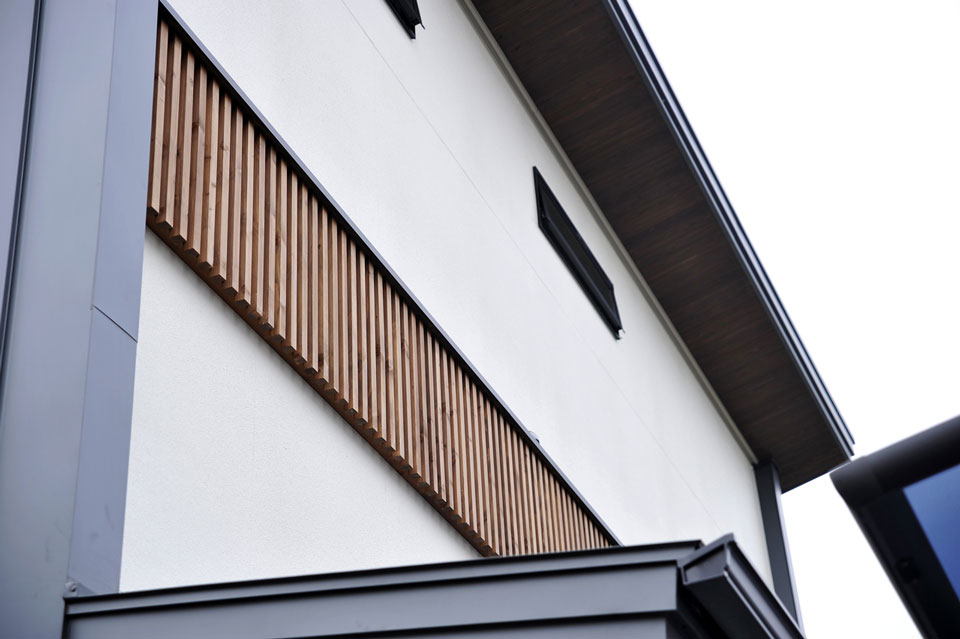 外観は、ガルバニウム鋼板とウッド素材の組み合わせ、全体がダーク系のトーンでまとまったシックな印象。